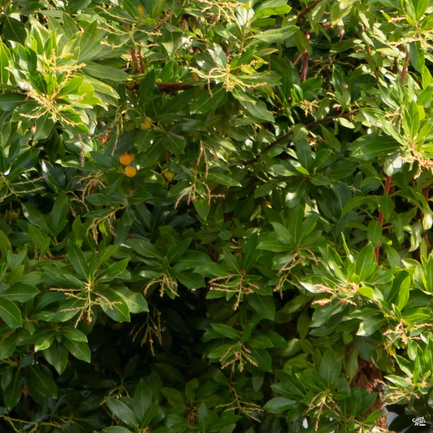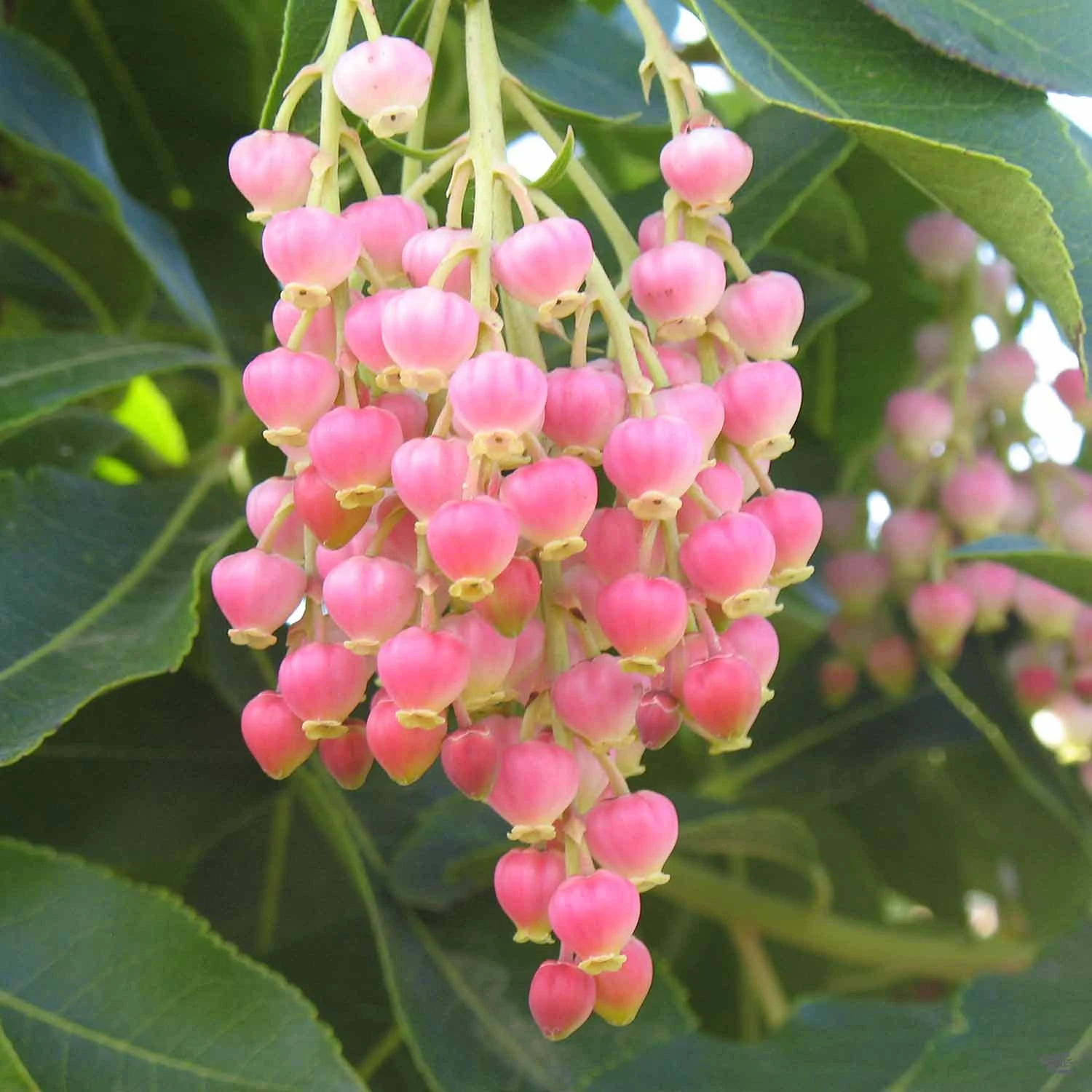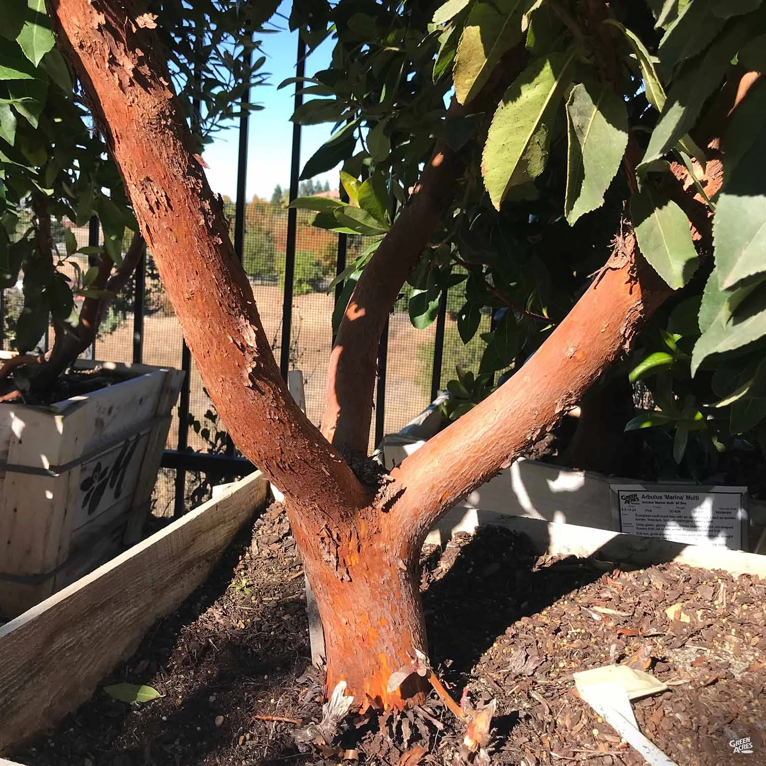 Evergreen multi-trunk tree with oval, dark green, glossy leaves. Smooth, mahogany, peeling bark. Showy, drooping clusters of rosy pink, bell-shaped flowers from fall to late winter. Used as screen, border or accent.Ā Natural, multi-trunk form.