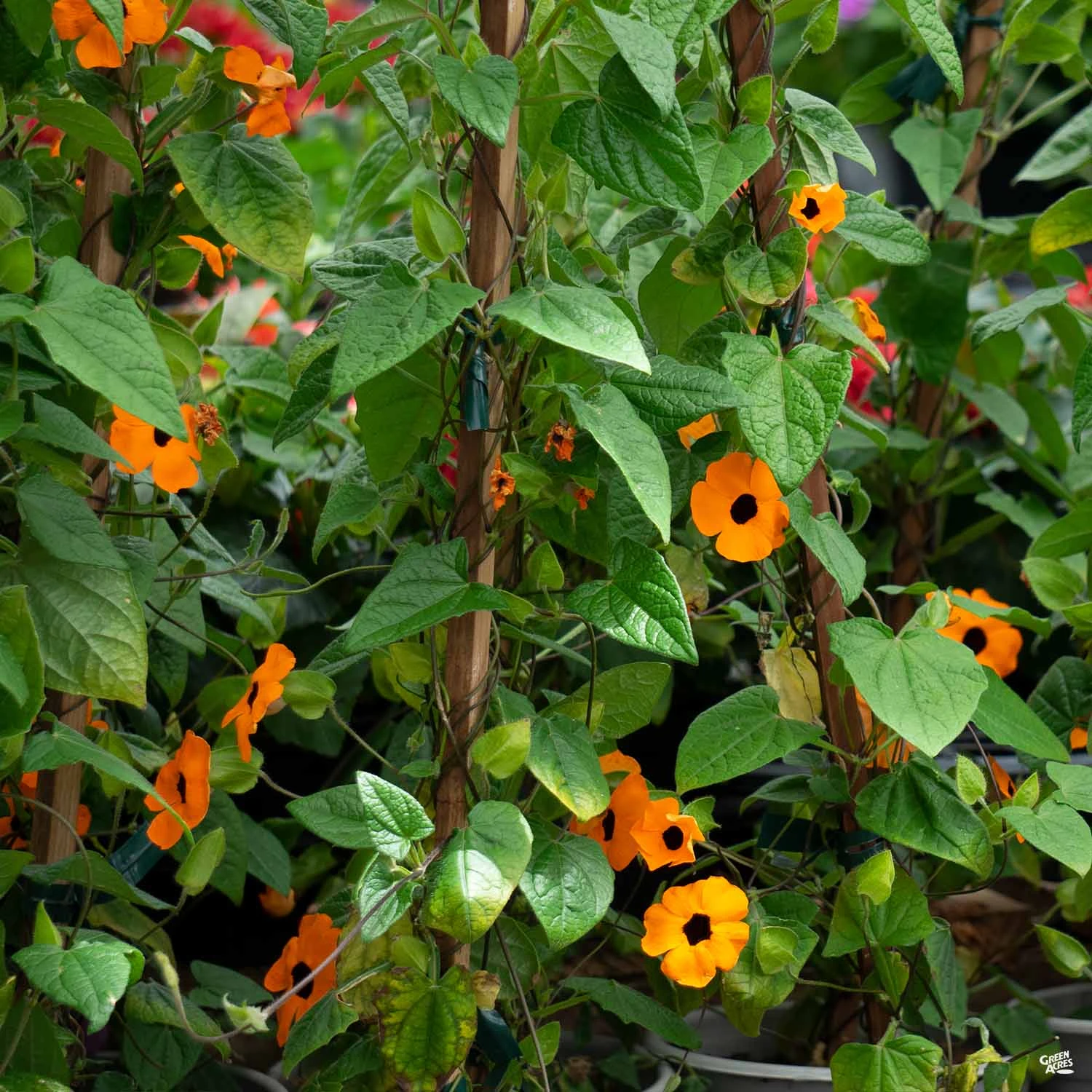 Perennial vine, grown as annual in our area, has triangular shaped, green leaves. Trumpet shaped flowers come in a variety of warm colors, feature purple-black throats and bloom continuously all summer.