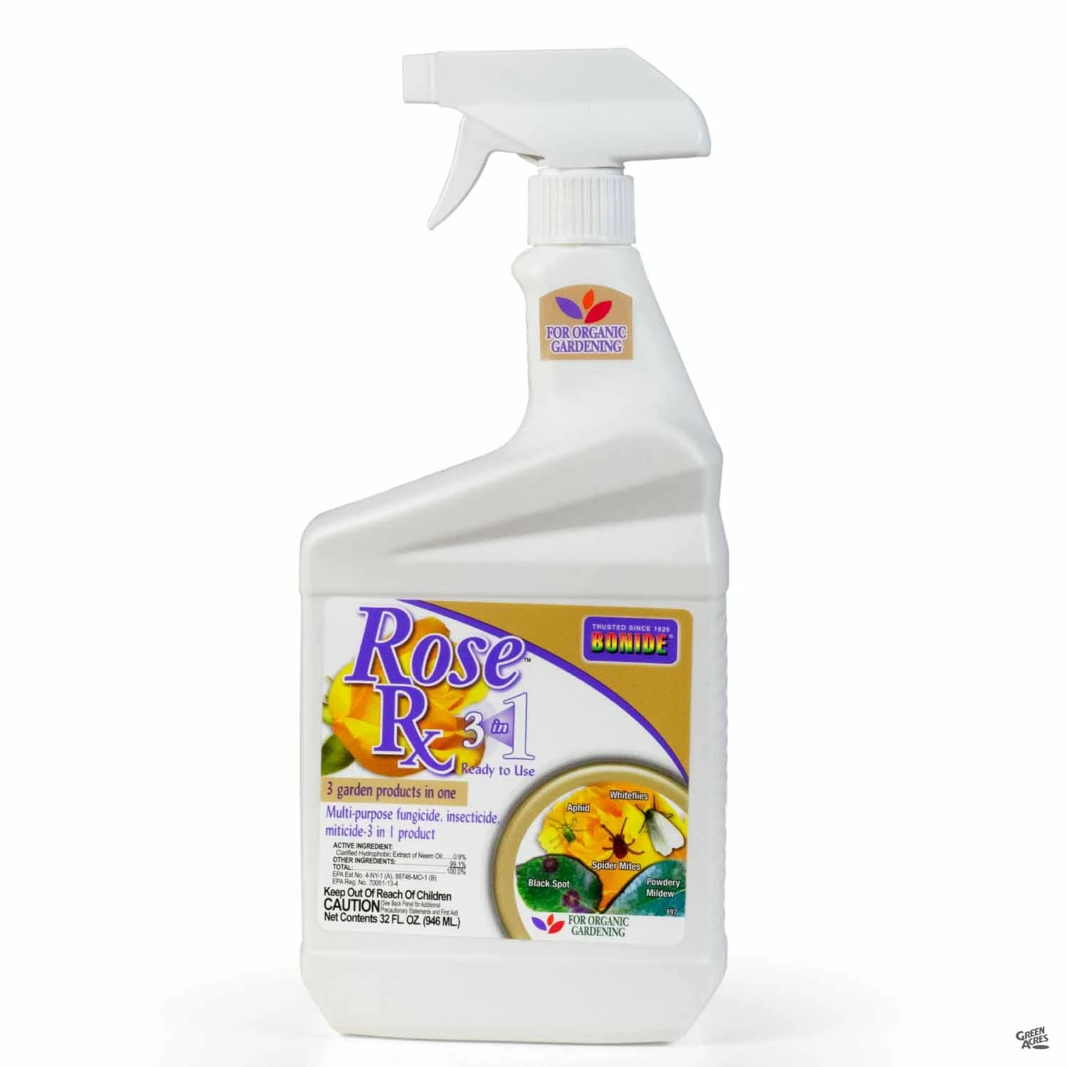 Broad spectrum spray controls all common rose pests including black spot, powdery mildew, mites, aphids, and white flies. 3-in-1 fungicide, miticide, and insecticide allows easy all-season protection to keep roses healthy and vibrant.