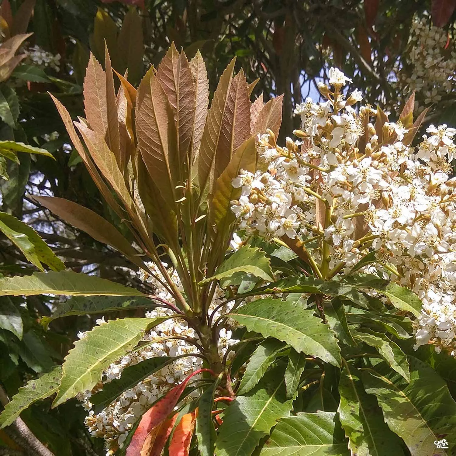 Evergreen small tree has a rounded growth habit. Large, shiny leaves emerge bright orange-red, aging slowly to green. White flowers in spring are followed by orange fruit. Good in containers, as a screening shrub or lawn tree. Trained into a standard, single trunk form.