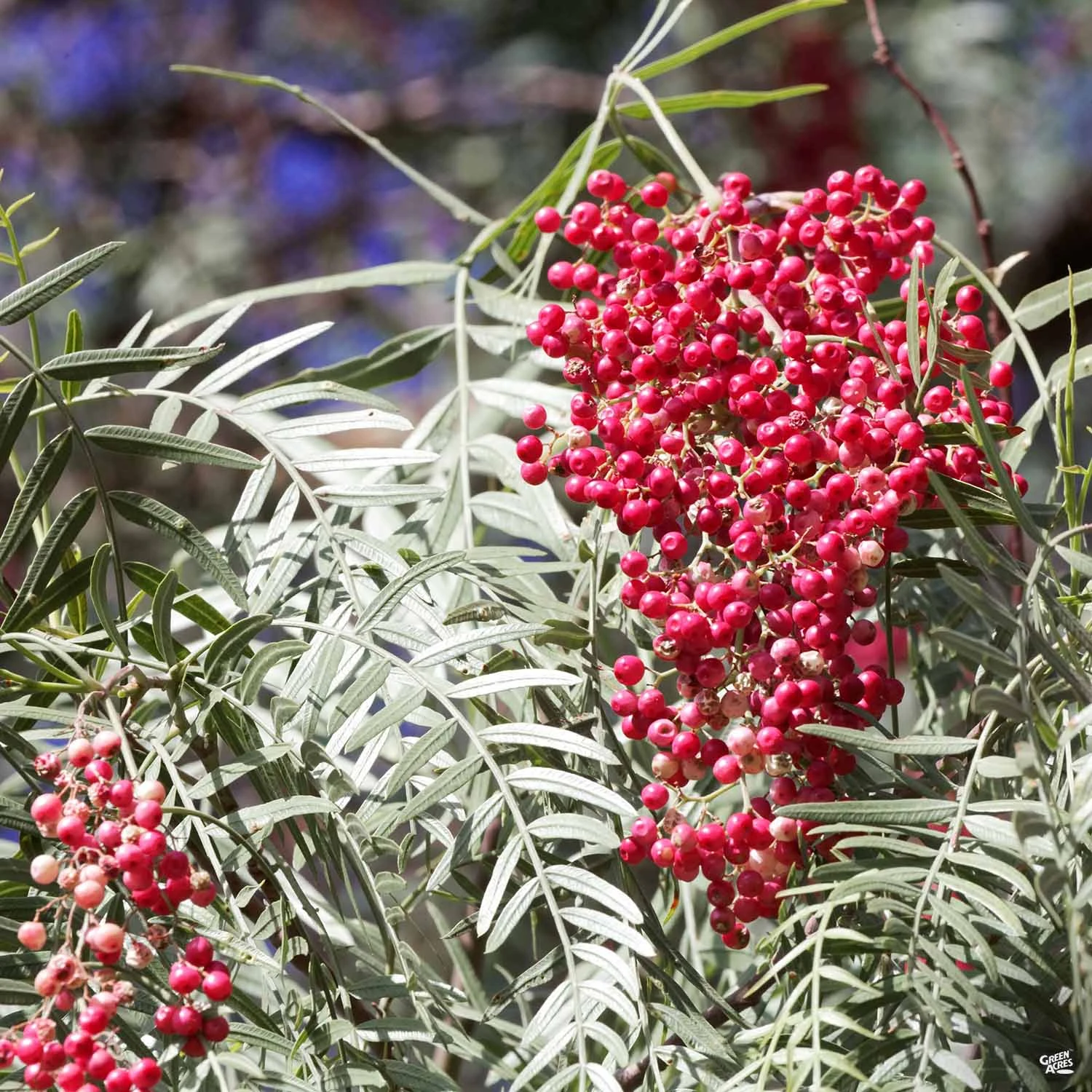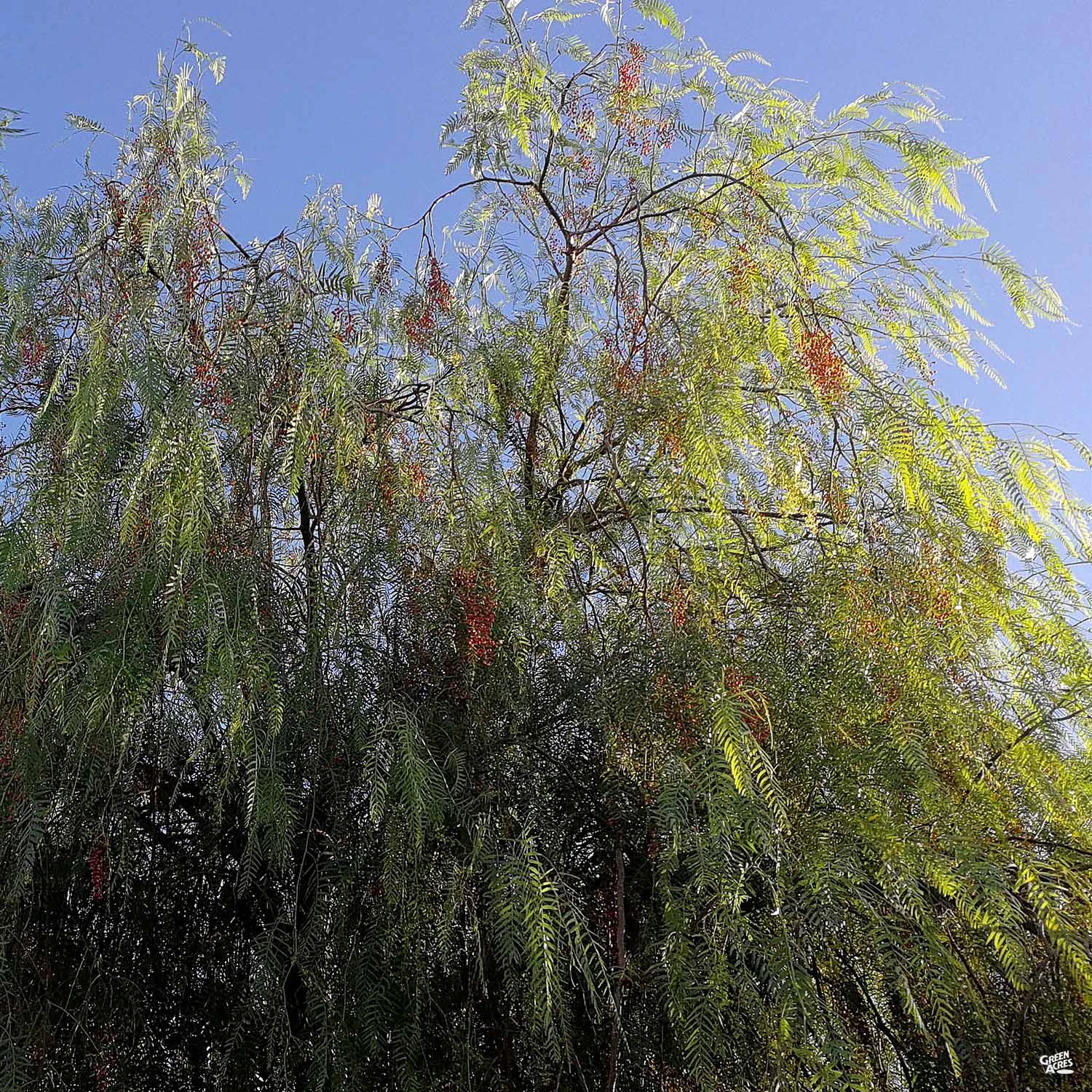 Vivid green, narrow leaflets hang gracefully from branches. Small, pale-yellow flowers in summer are often followed by red berries that attract birds. Excellent shade tree in a waterwise landscape. Trained into a standard, single trunk form.