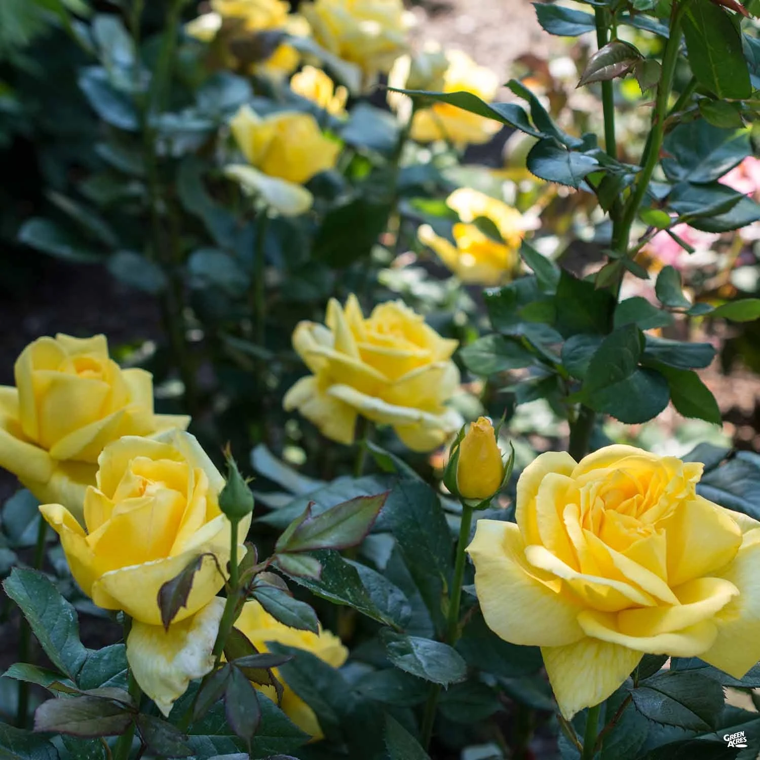 Classically shaped rose with soft yellow petals that flicker with intensity throughout. Blooms are complimented with a bright, citrus scent of oranges and lemons. High disease resistance ensures dark, glossy green foliage year round. Blooms spring through fall. Excellent container plant, landscape accent or border plant. Petal count: 35