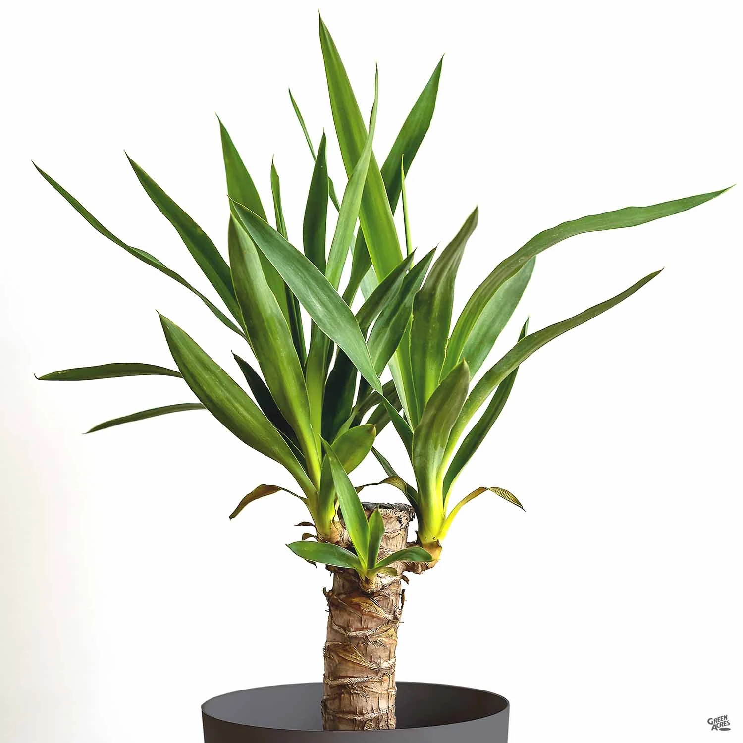 Evergreen perennial with shoots that grow straight. Has a rosette of wide green leaves that grow from the central cane. The Yucca’s attractive bark is further exposed as new leaves grow to replace older leaves towards the base. Use as houseplant. Prized for its air purifying nature.