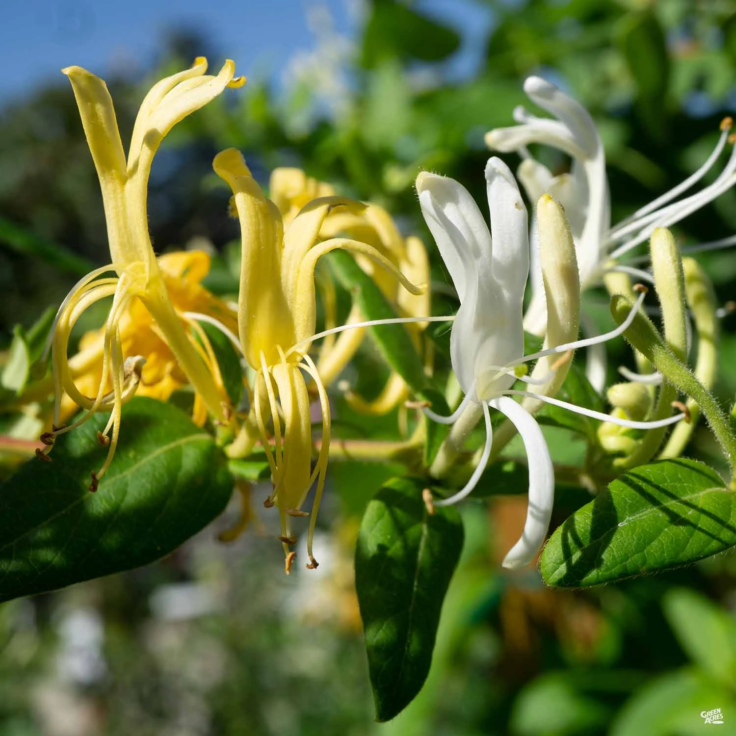 Semievergreen, vine has large clusters of tubular white-and-yellow, fragrant flowers that bloom spring through fall. A time-honored hummingbird plant. Great on a fence, arbor, trellis or as a ground cover.