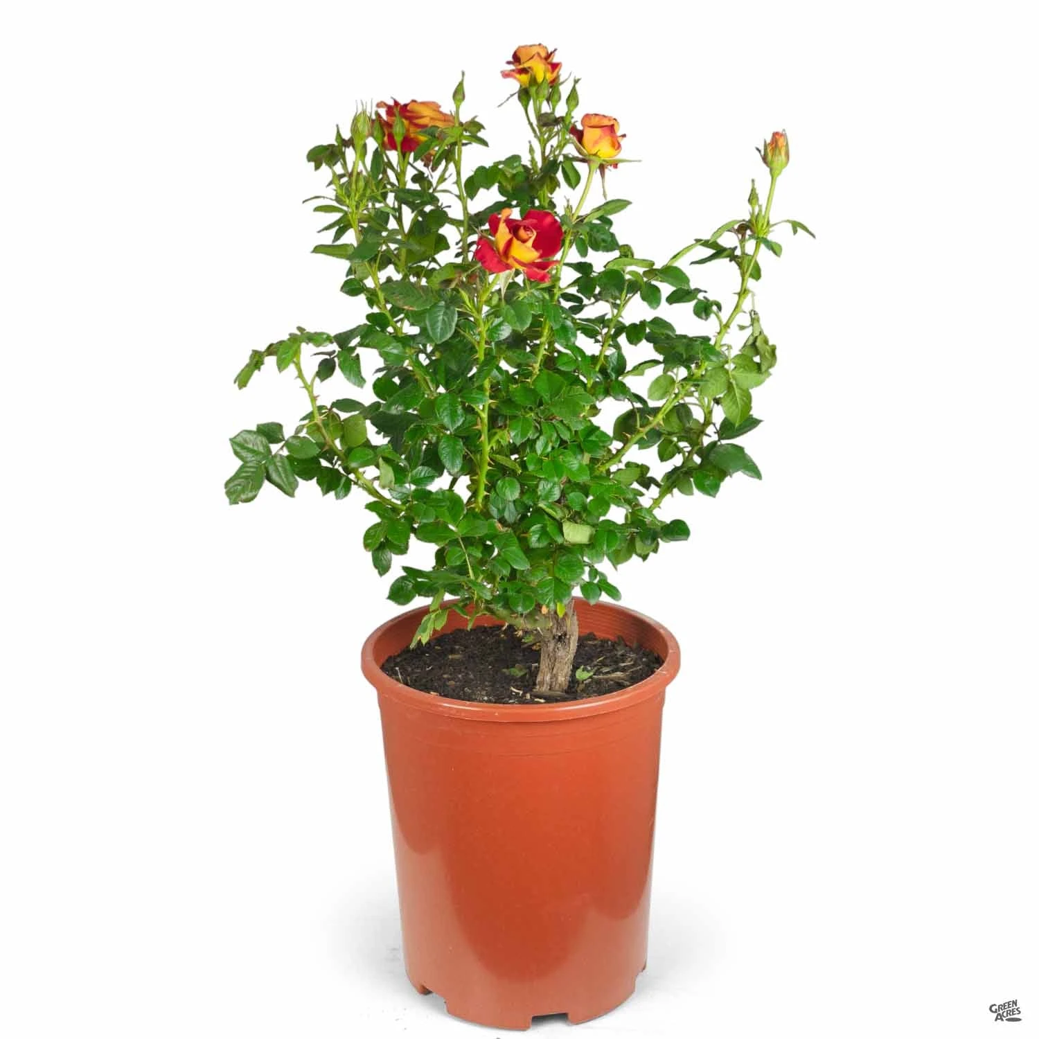 Mustard yellow buds open with a dark, ketchup red on the inside of the petals. Dark, glossy green foliage. Excellent container plant, landscape accent or border plant.