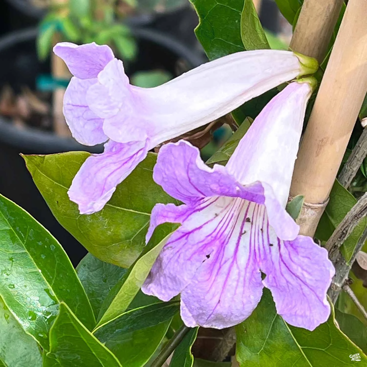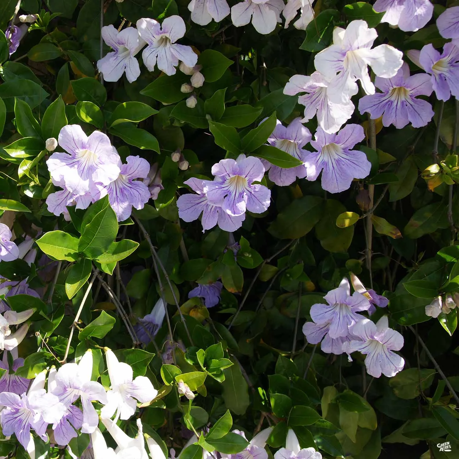 Evergreen vine with a climbing habit has glossy, green leaflets. Lavender, trumpet-shaped flower clusters bloom in summer and fall. Can be used as a ground cover, espalier, in containers or as a screen.