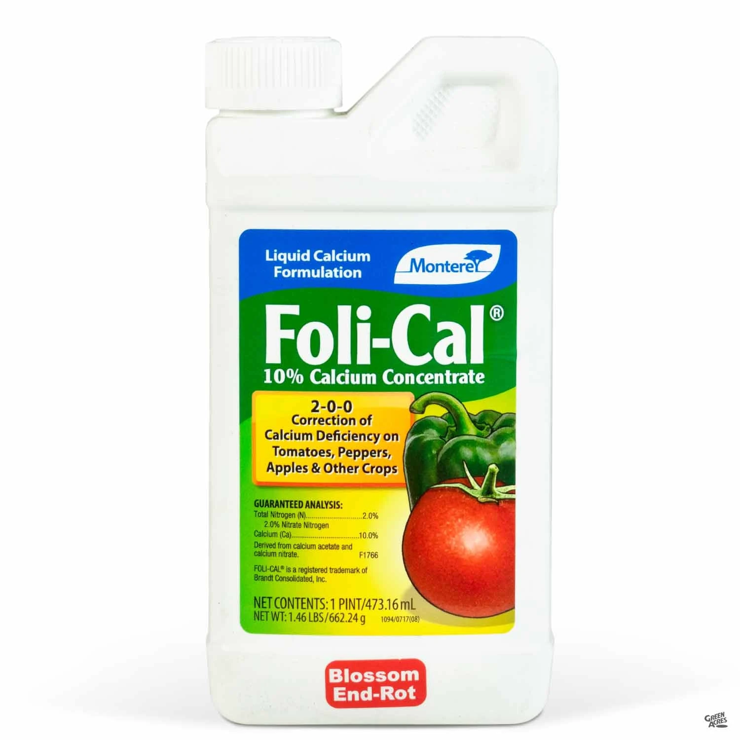 Liquid calcium concentrate treats a variety of calcium deficiency related diseases in fruit and vegetable plants. Treatment includes Bitter Pit in apples, Blossom End-Rot in peppers, cucumbers, and melons, Internal Brown Spot in potatoes, Cork Spot in pears, and Internal Browning in grapes.