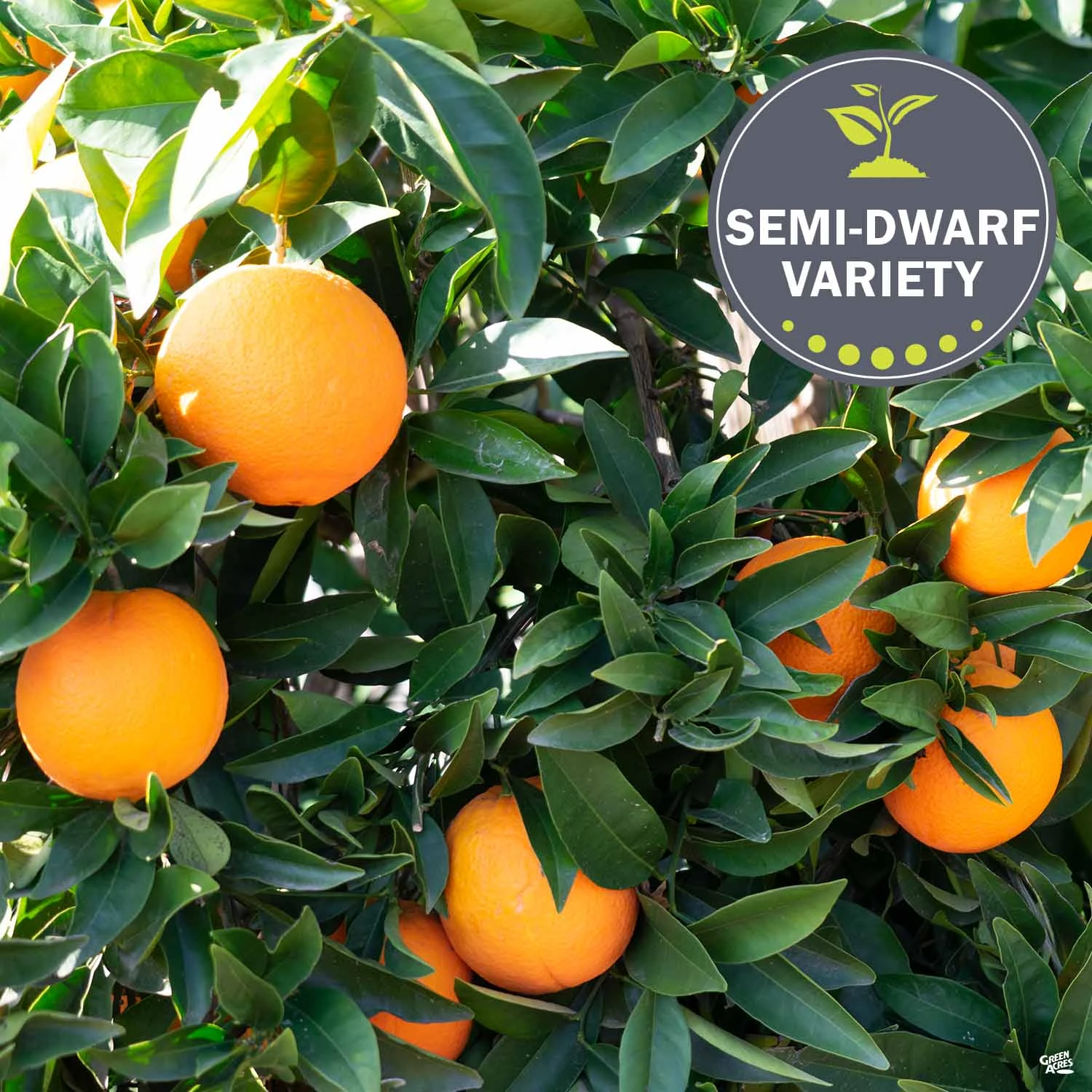 Evergreen, semi-dwarf citrus yields large navel oranges late fall to early winter. Richly sweet fruit is a popular choice for juicing.