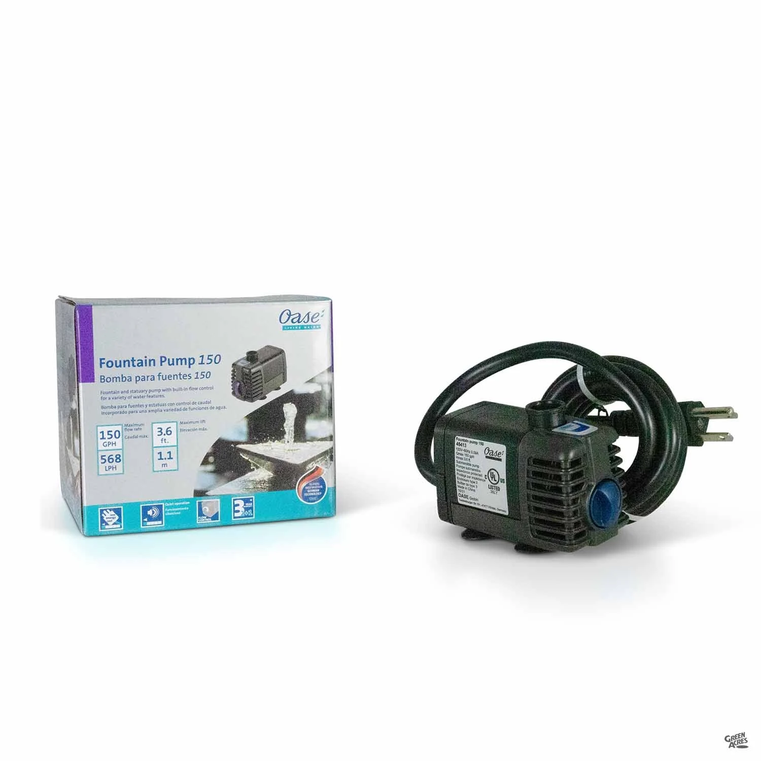 High efficiency fountain pump with low power consumption and compact form. Features adjustable flow control, suction cup feet for stability, and grounding plate. Choose GPH model based on fountain/tubing height.
