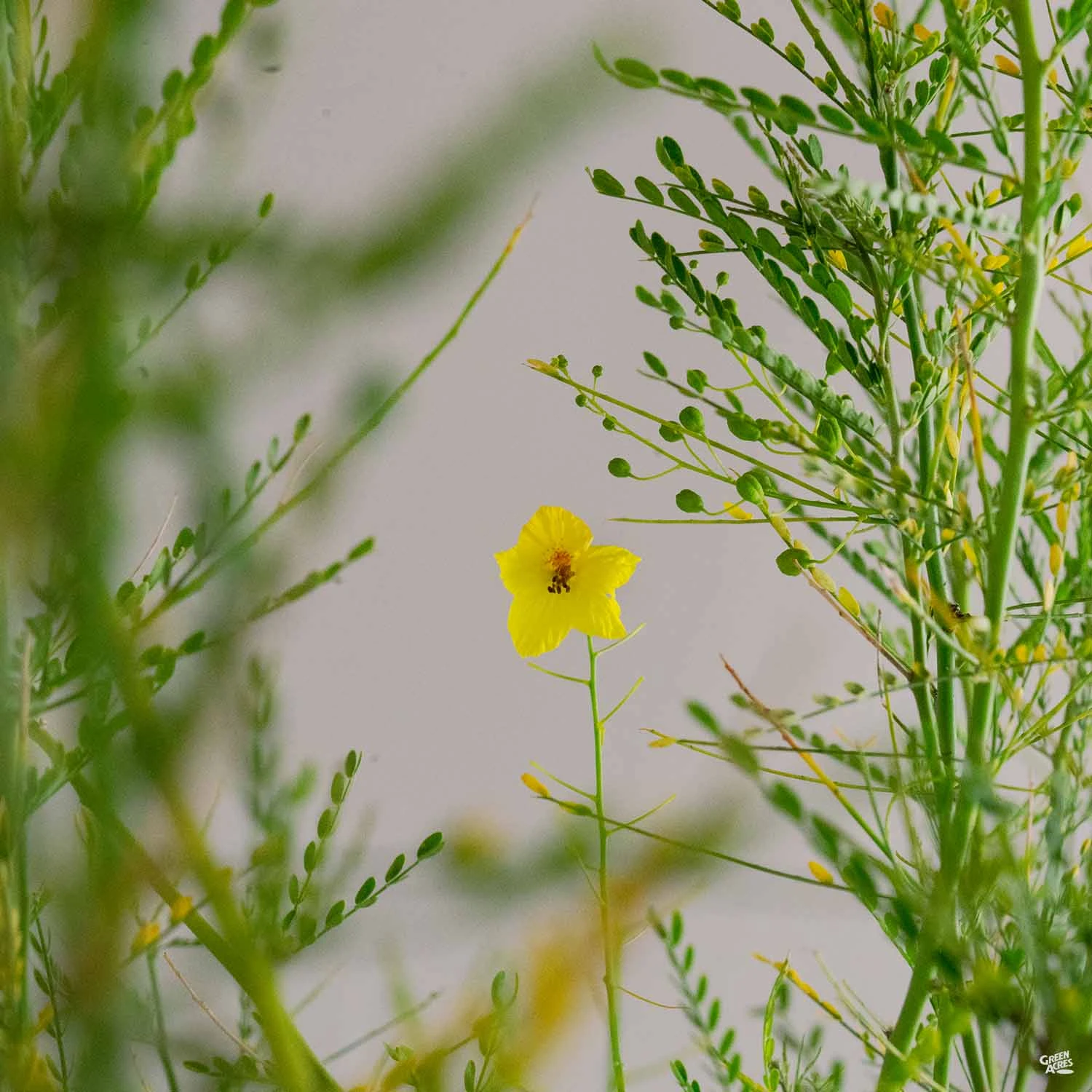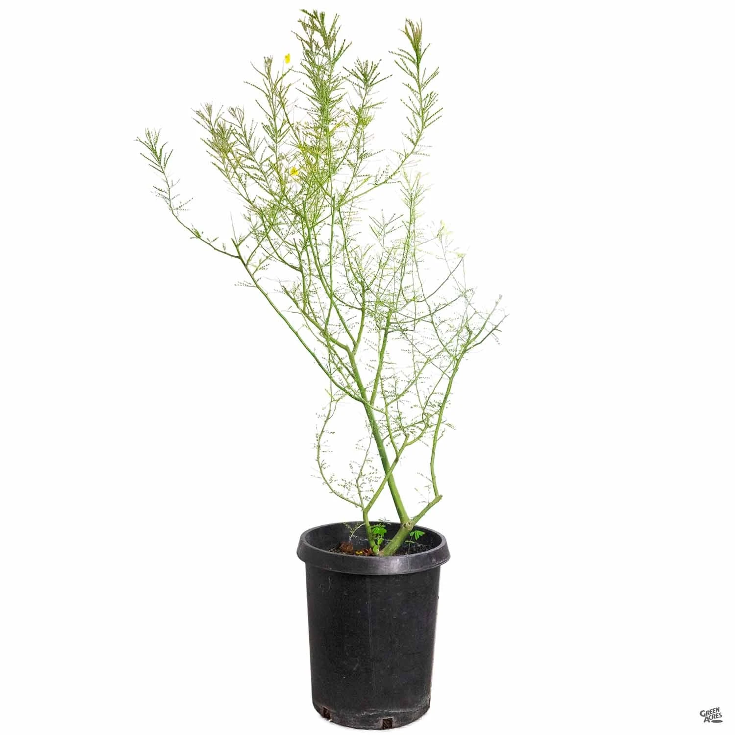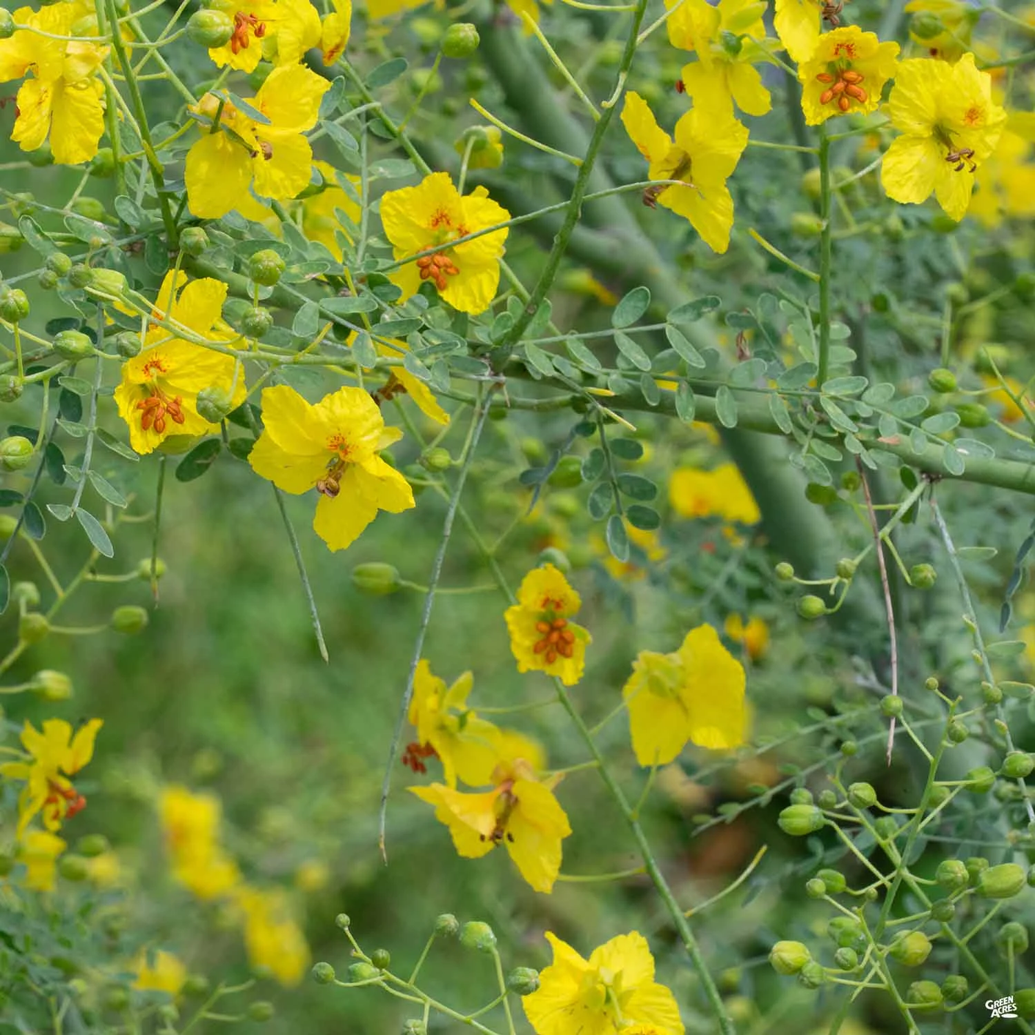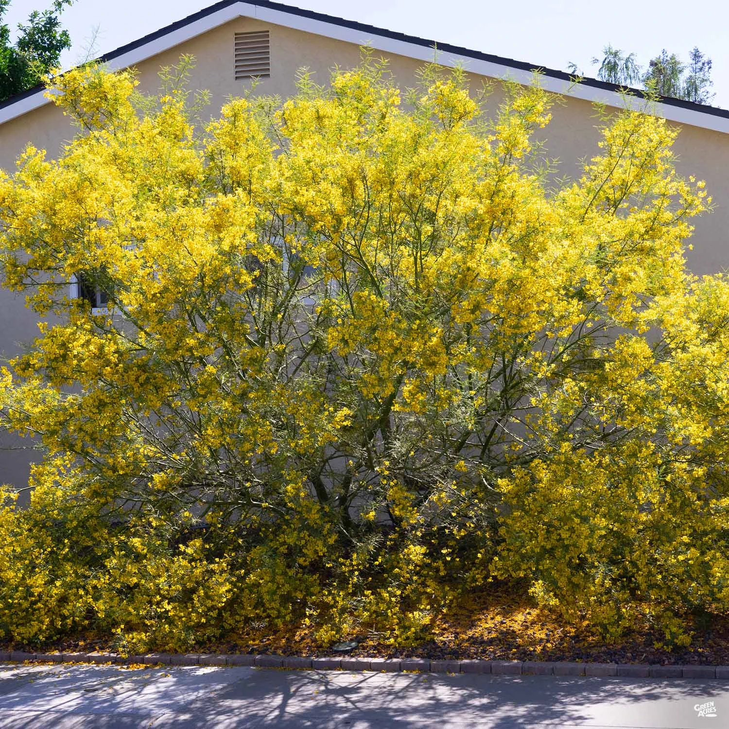 Deciduous tree has light green stems and leaves. Large, yellow blossoms bloom in abundance spring and summer. This thornless hybrid produces few seedpods. Excellent choice as a shade or ornamental tree in a low water landscape. Grown in a natural, multi-trunk form.