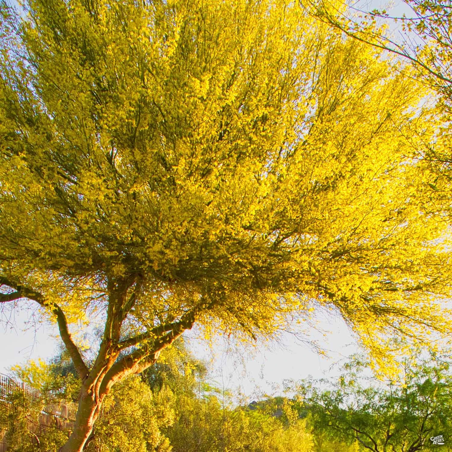 Deciduous tree has light green stems and leaves. Large, yellow blossoms bloom with abundance in spring and summer. This thornless hybrid produces few seedpods. Excellent choice as a shade or ornamental tree in a low water landscape. Grown in a standard, single trunk form.