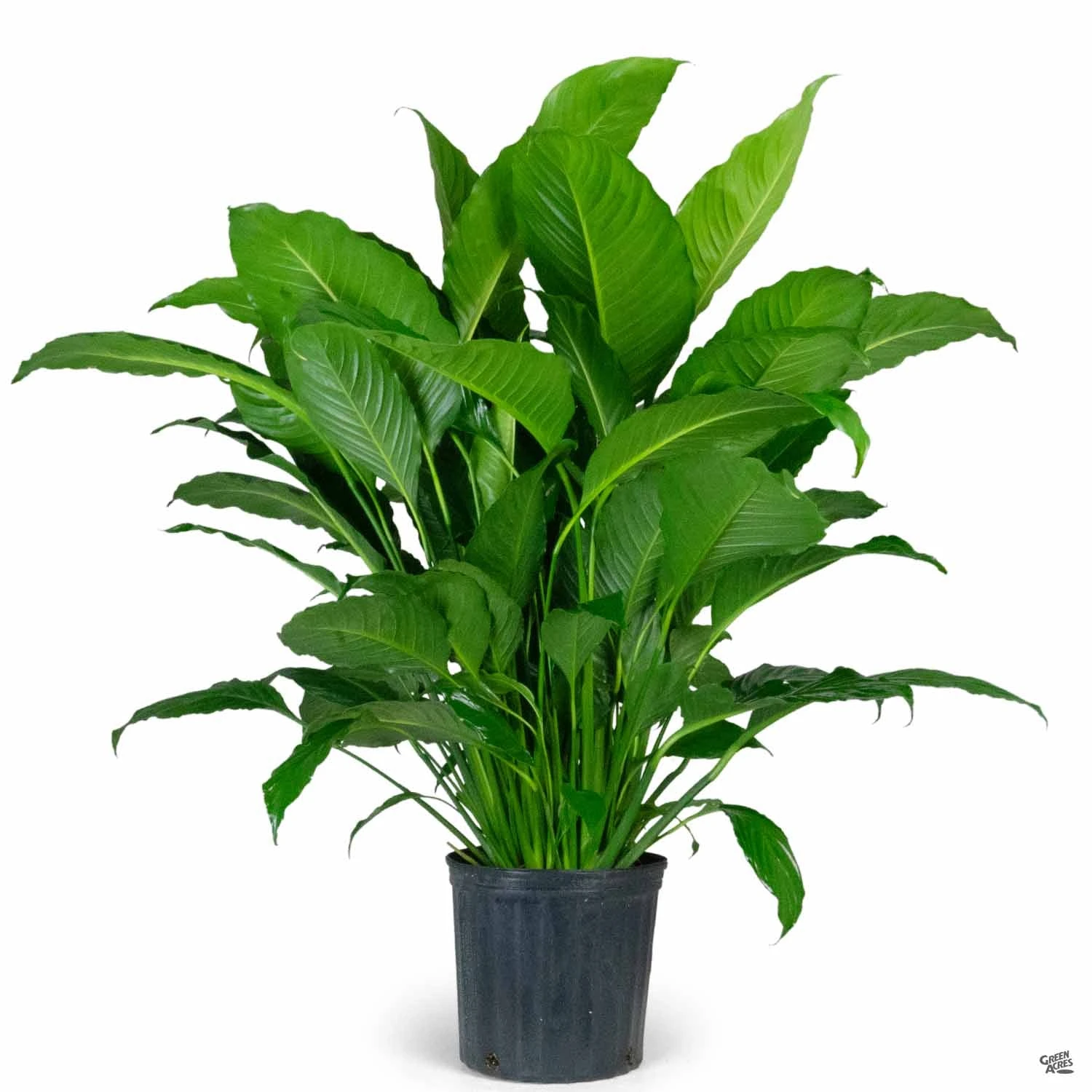 Evergreen perennial with large leaves of various widths. White spathe and spadix “flower” bloom continuously. Excellent at removing toxins from the air.