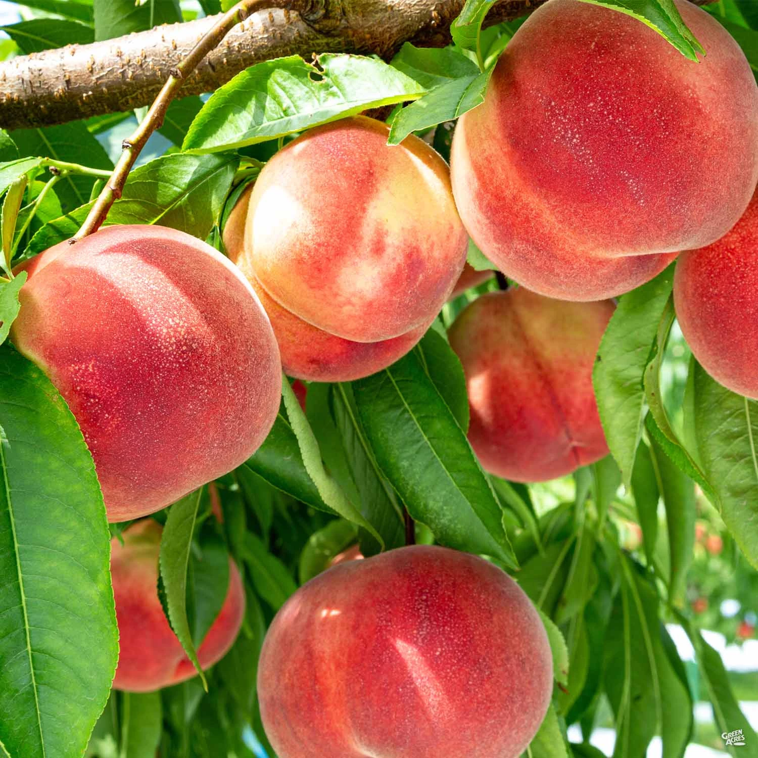 Peach variety adorned with aromatic, juicy peaches with red, fuzzy skin and red-streaked, white flesh in late summer. Low acidic, sweet fruits easily release from freestone pit. Self-fruitful.
