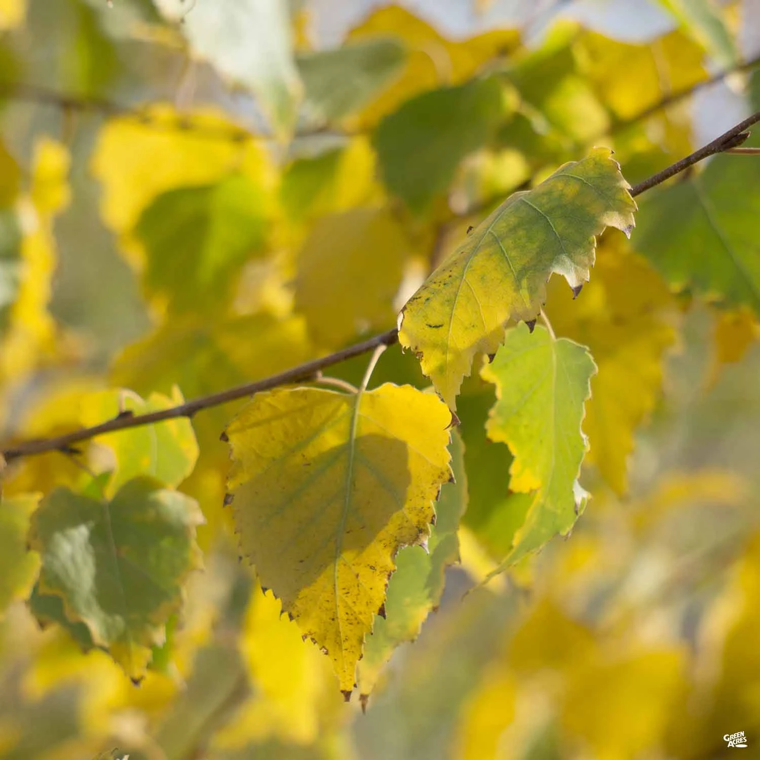 Serrated, diamond-shaped, green leaves turn yellow in fall. Glossy, pink, smooth, young bark matures to brown flakes. Excellent for erosion control, windbreak, accent or lawn tree. Grown in a multi-trunk form.