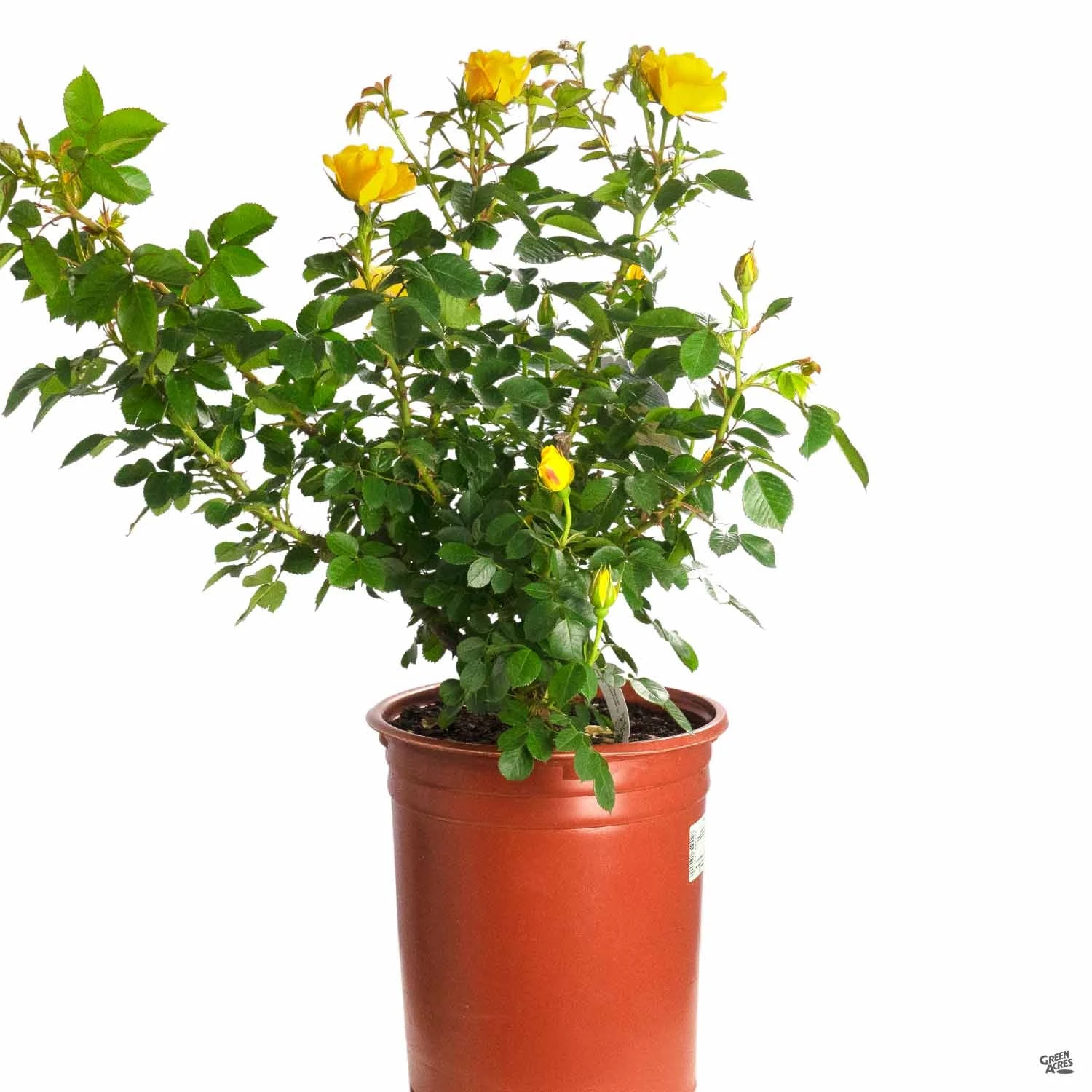 Dark, glossy green foliage contrasts nicely with bright, golden yellow roses. Blooms spring through fall. Perfect container plant, landscape accent or border plant.