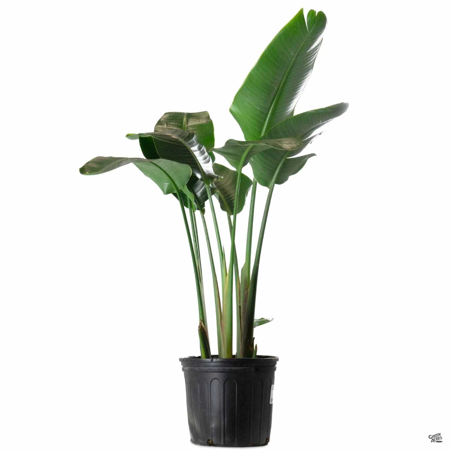 Clumping, tree-like form grown for dramatic, tropical foliage. Flowers are white with a dark blue “tongue”. Excellent for tall, narrow spaces.