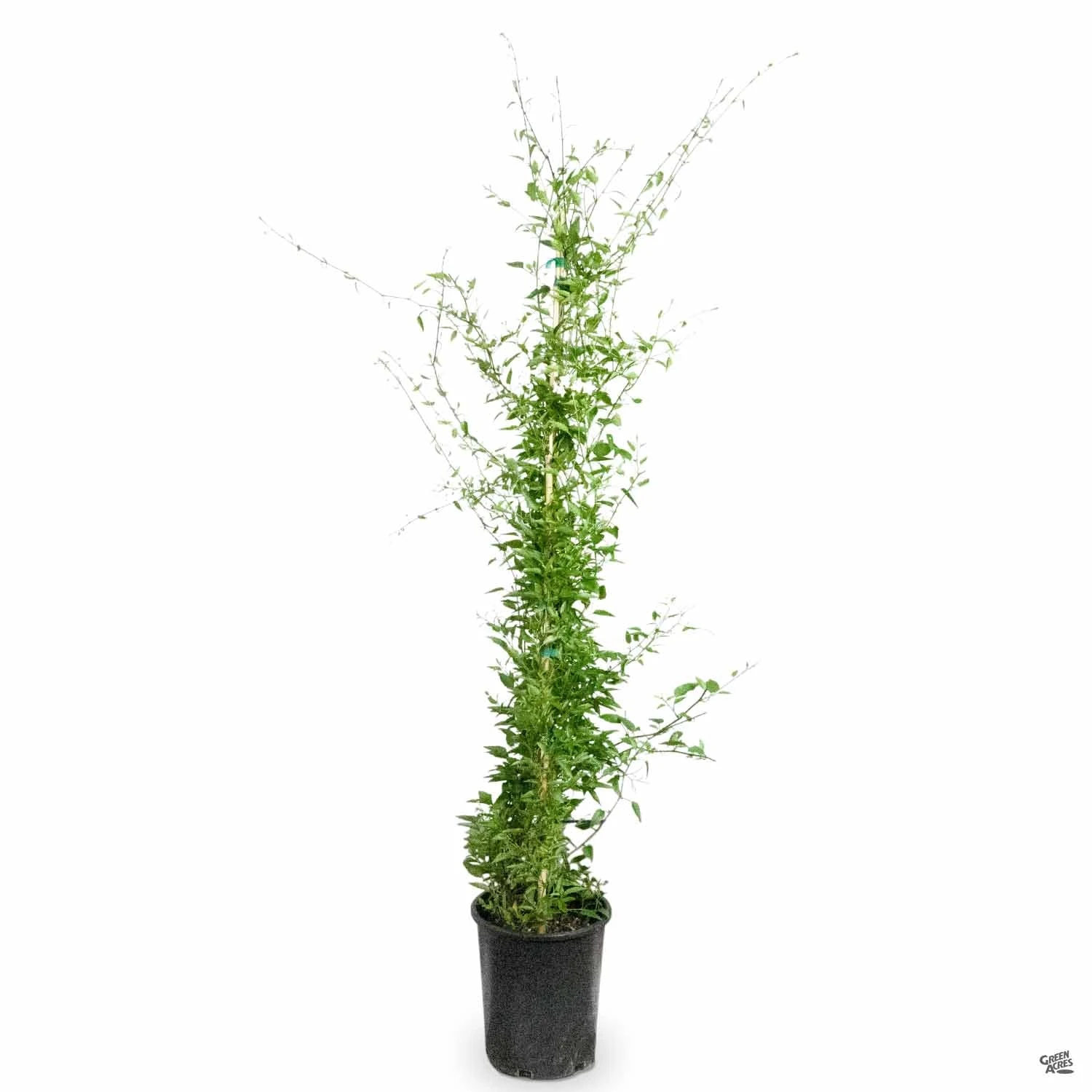 Evergreen vine with matte, deep-green leaves. White, star-shaped flowers with a yellow center, bloom mostly in spring and intermittently the rest of the year. Use as a screen.
