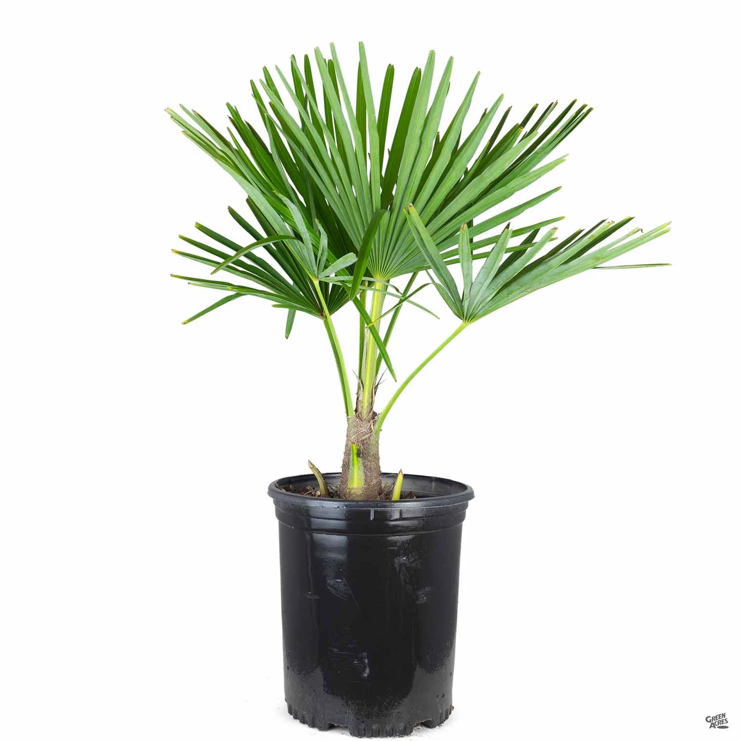 Evergreen palm native to China will add a tropical feel to your landscape. Grows 3ft wide green fans on spiny leafstalks. Thick trunk is covered with dense, blackish fiber. Excellent in containers or around swimming pools.